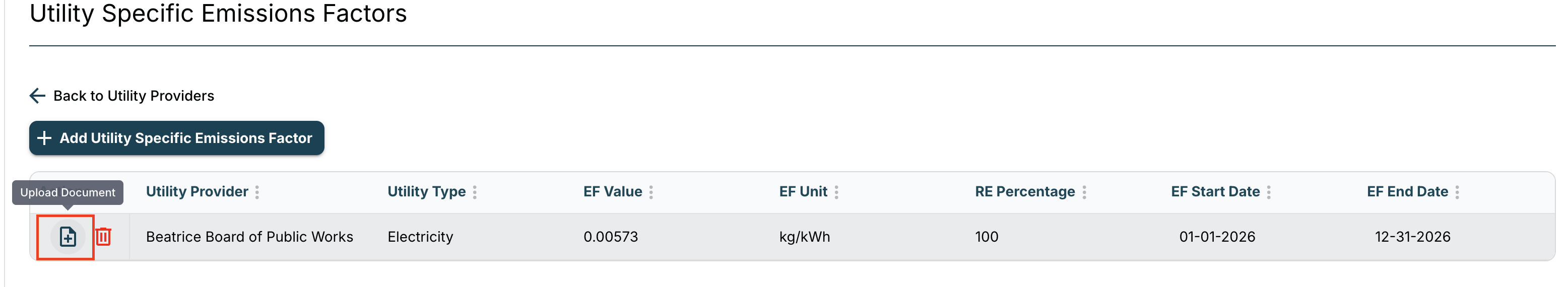 - The emission factor will now appear as a new row. A document icon will indicate that supporting documentation has not yet been added