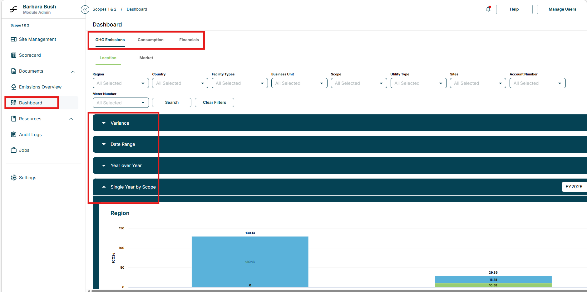Metrics are presented across three dashboards—GHG Emissions, Consumption, and Financials. Each dashboard allows users to filter visualizations by scope, site, utility, or year. Through these interactive charts, users can identify trends, spot outliers, and gain a comprehensive understanding of overall energy impact.