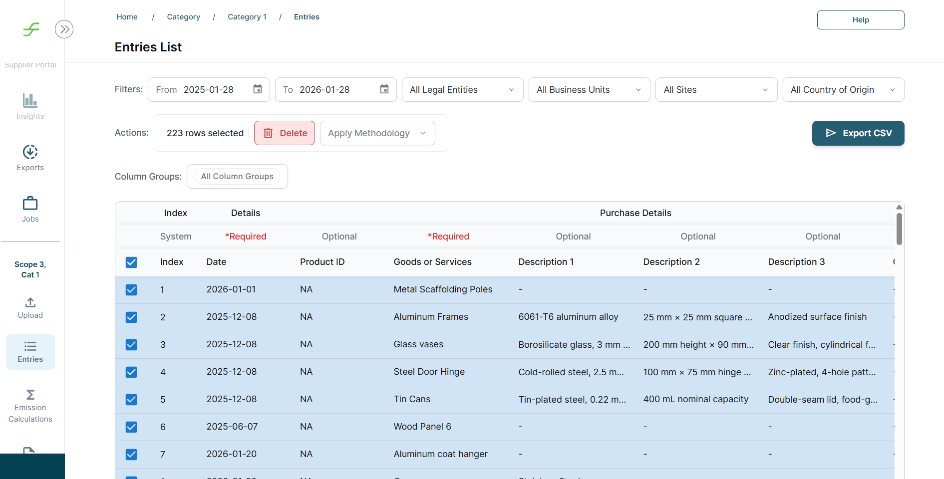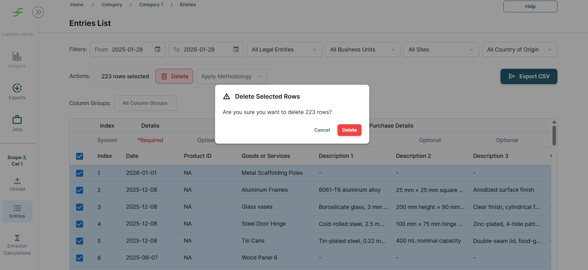 Data can be deleted from the Scope 3 platform by selecting the relevant entries on the Entries page and using the Delete option.