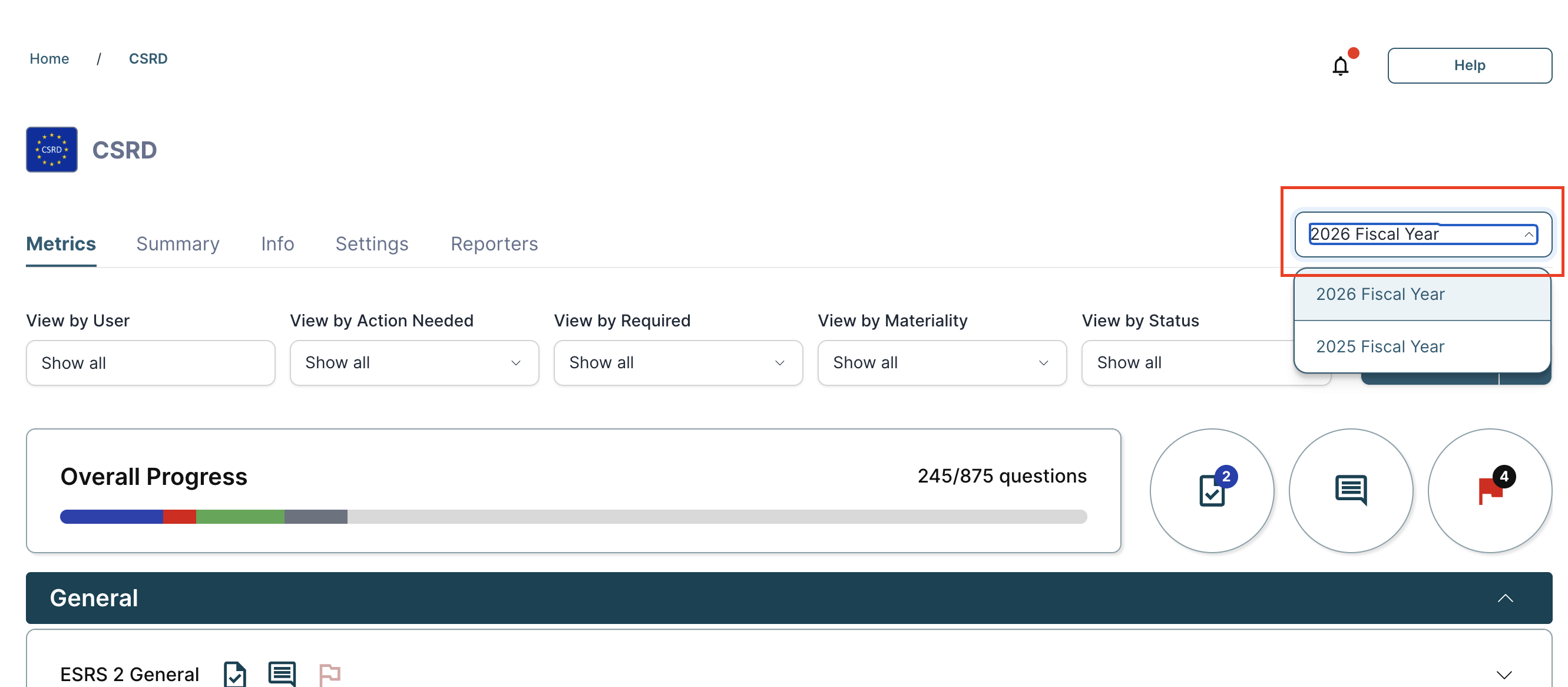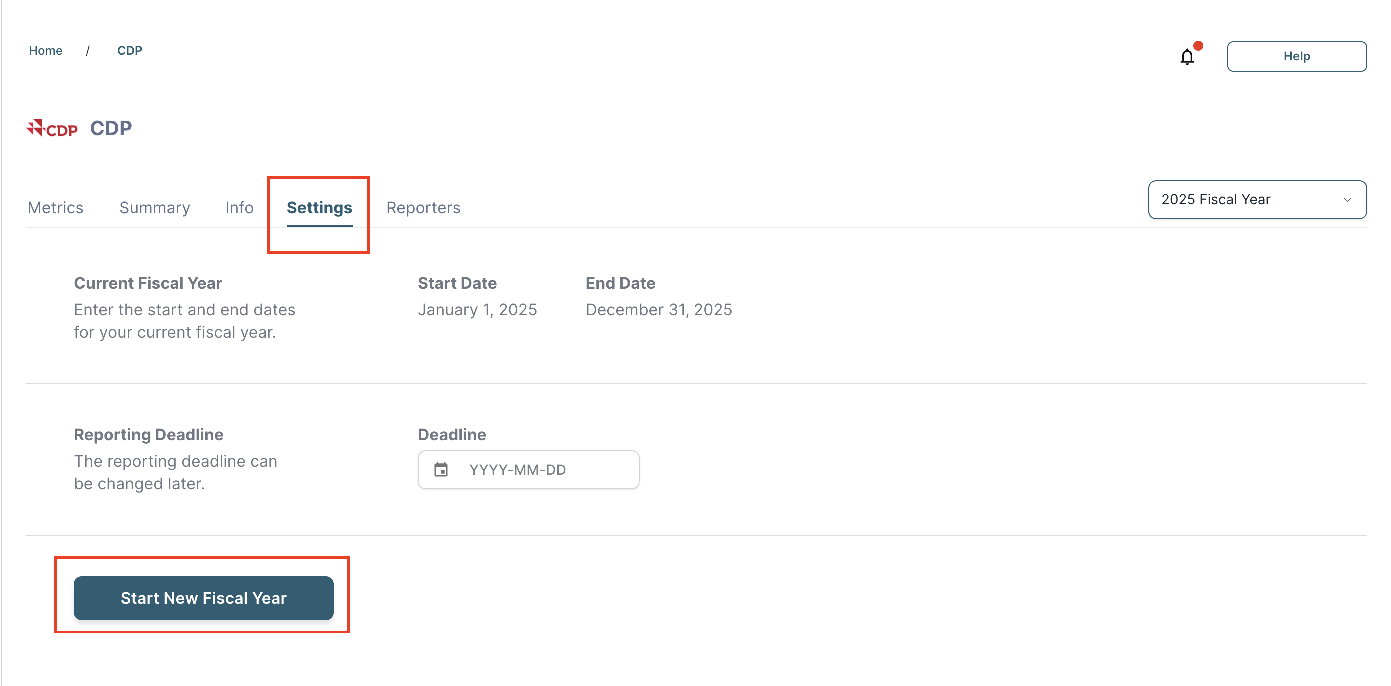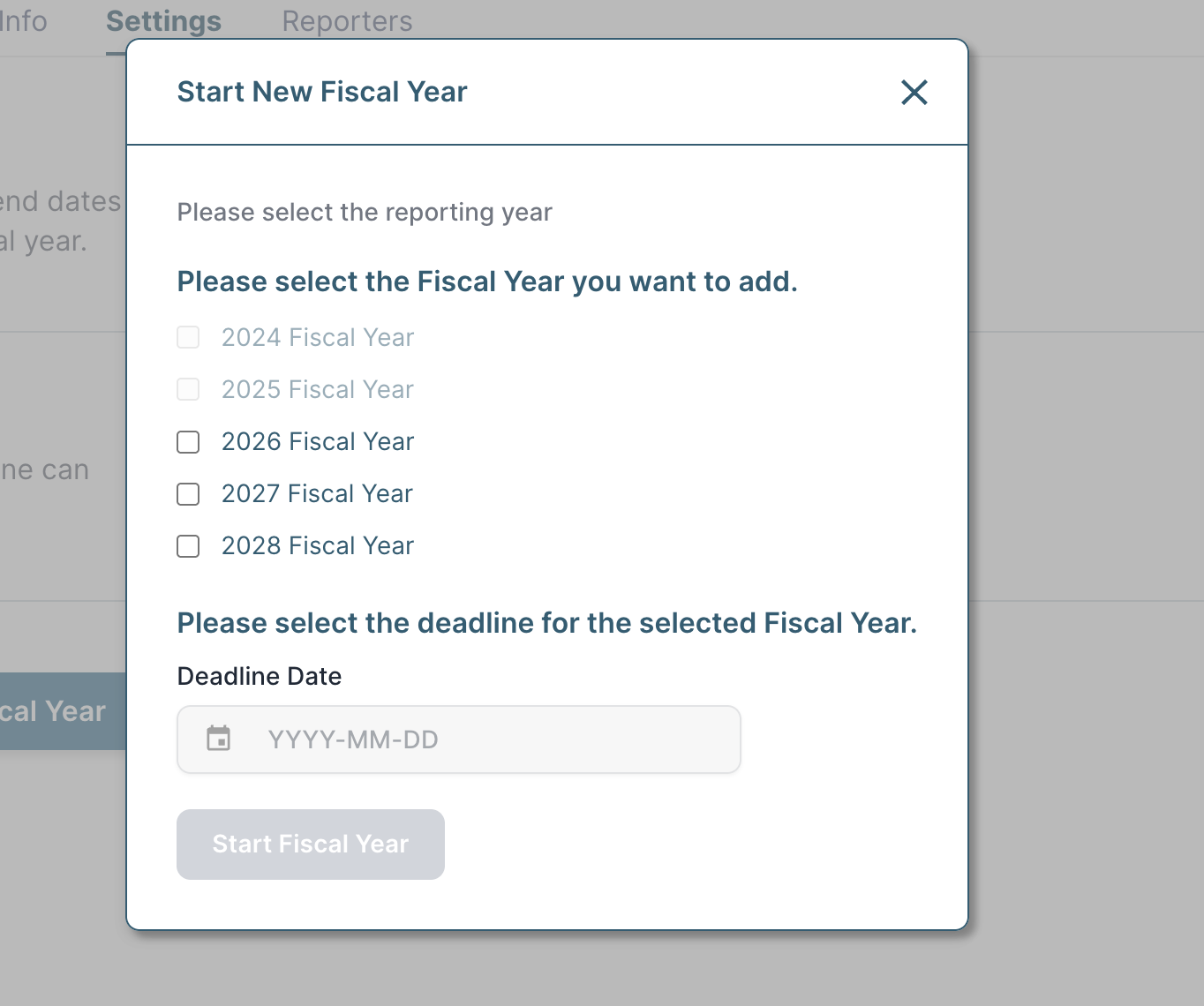 Navigate to the relevant framework, click into Settings, and select ‘Start New Fiscal Year.’