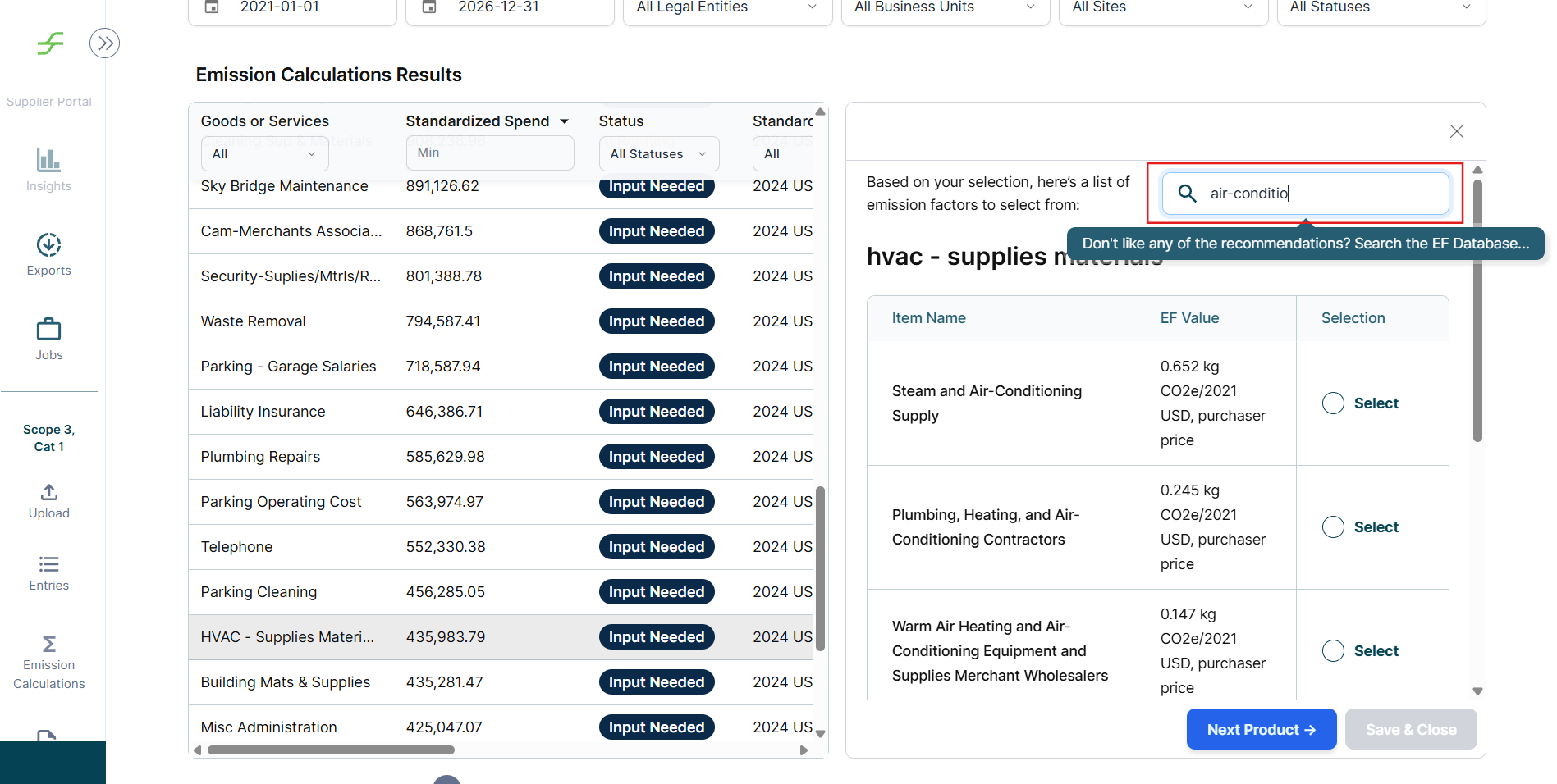 This also enables users to search beyond their default emission factor database, ensuring flexibility to compare, identify and apply the most appropriate emission factor for a given entry.